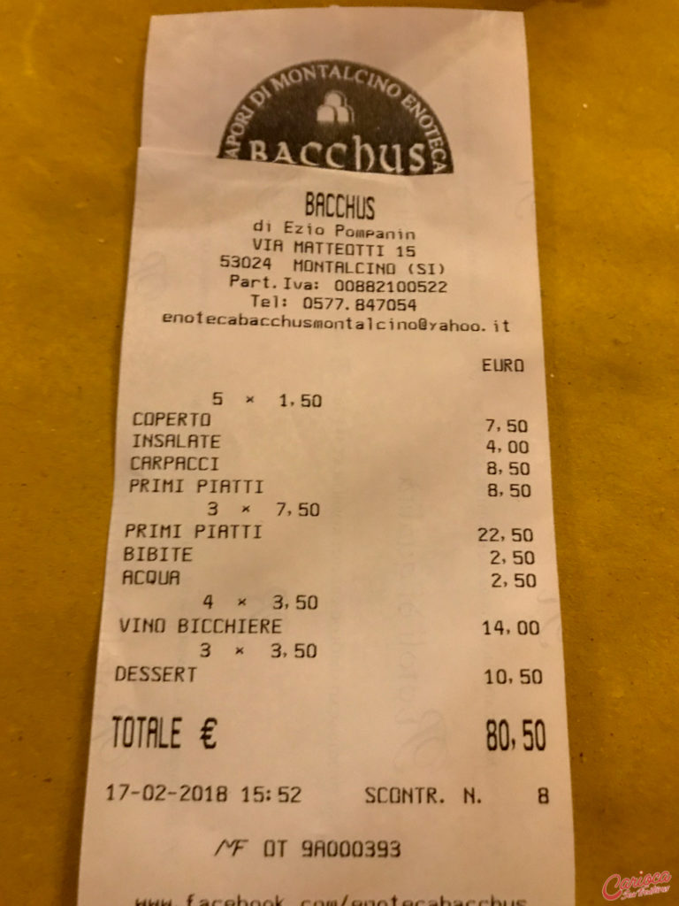 Além do excelente atendimento de um senhor com a maior cara de Nonno, a comida era muito boa. Nós comemos uma das melhores lasanhas das nossas vidas pela bagatela de 7,50€. Ainda finalizamos o almoço com um belo de um Tiramissu com Chantilly, mas não sem antes degustar uma boa taça de vinho. Afinal, não é todo dia que se paga bem e barato por um vinho de excelente qualidade. E tudo isso por um precinho bem justo. Em resumo, a conta para 5 pessoas saiu por 80,50€, ou seja, super em conta para os itens pedidos. E nós saímos felizes da vida com o excelente almoço e passeio, digno de mais um dia na Toscana. Fechamos o tour com chave de ouro!