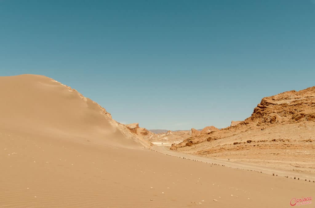 Ao longo do trajeto é possível ver indicação de várias trilhas. Sim, o Valle de la Luna cabe perfeitamente no roteiro daqueles que querem fazer trekking no Atacama. Por isso, se essa é a sua intenção, o ideal é chegar no parque pela manhã ou então, fechar um passeio somente para lá.